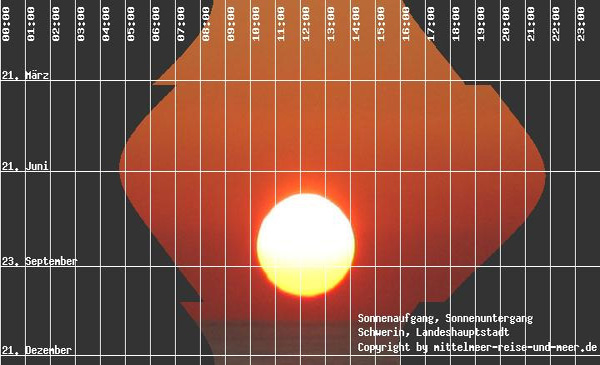 Diese Grafik zeigt den Jahresverlauf von Sonnenaufgang und Sonnenuntergang in Schwerin, der Landeshauptstadt von Mecklenburg-Vorpommern. Die Angaben erfolgen in Mitteleuropäischer Zeit (MEZ) bzw. Mitteleuropäischer Sommerzeit (MESZ), daher auch die kleinen Knicke in der Grafik.